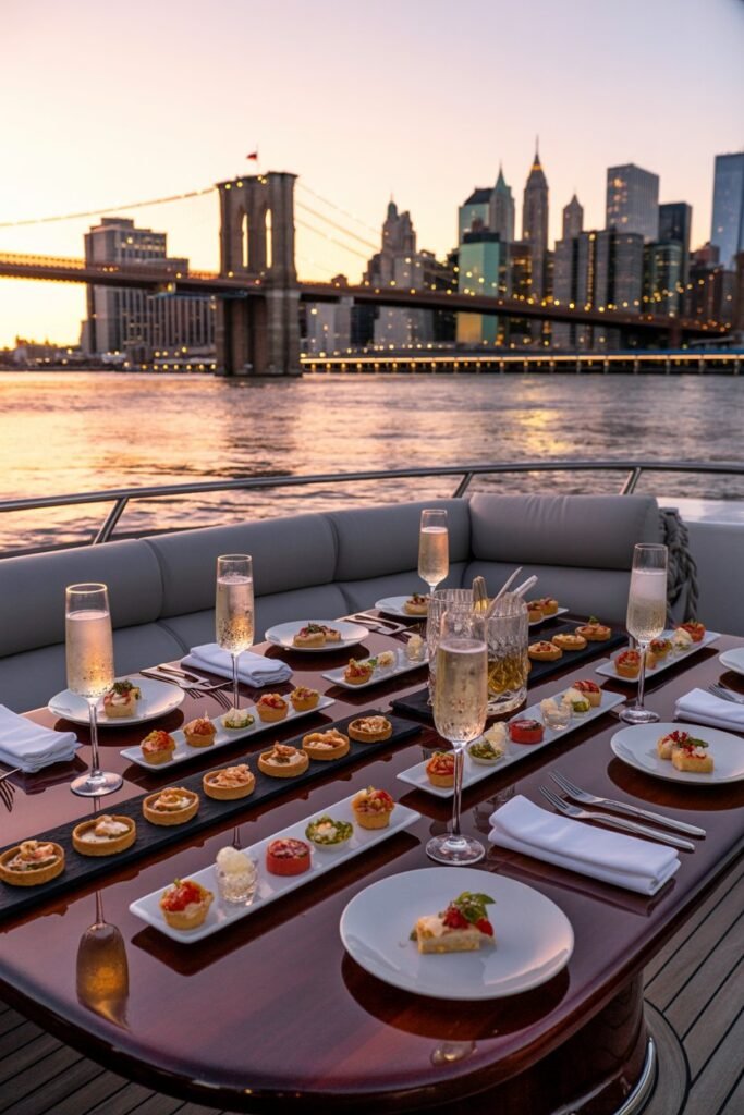 You get a full meal on the boat, often featuring multiple courses and local specialties, while floating past iconic landmarks like the Statue of Liberty and the Brooklyn Bridge.